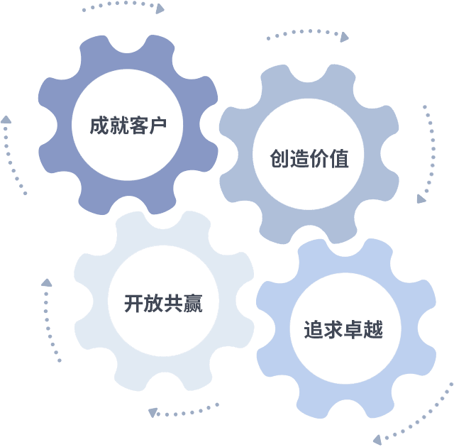 成就客户是一切决策的出发点,,,创造价值是衡量所有工作的标准,,,,追求卓越是我们做事做人的态度,,开放共赢是我们的格局也是最终的结果。。。。价值观的齿轮环环相扣,,,推动着组织里的每个人不断向前。。